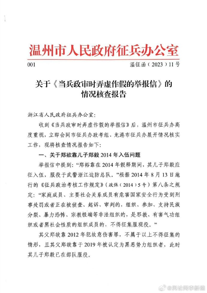 近日,举报人郑裕雪拿着两份温州市、龙港市征兵办转交给他的两份关于“当兵政审弄虚作假”的核查文件告诉舆论网说,其中温州市人民政府征兵办公室出具的温征函〔2023〕11号报告,披露了一起“亲属涉重大犯罪仍通过政审”的典型案例,引发公众对征兵政治审核机制严密性的质疑。